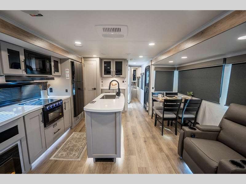 Sleeps 4 Slides 2 Length 33 ft 11 in Ext Height 11 ft 3 in Hitch Weight 802 lbs GVWR 9450 lbs Dry Weight 7486 lbs Fresh Water Capacity 45 gals Grey Water Capacity 90 gals Black Water Capacity 45 gals Available Beds Queen Refrigerator Type 12V Refrigerator Size 10 cu ft Cooktop Burners 3 Shower Size 30" x 36" Number of Awnings 2 TV Info LR 50" TV Awning Info 10' and 21' Axle Count 2 Shower Type Standard Electrical Service 50 amp Solar Wattage 400 watts Similar Floorplans