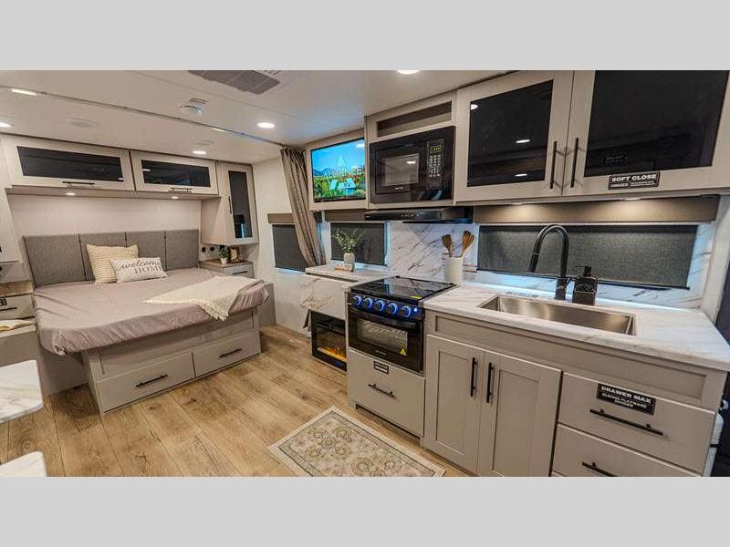 Sleeps 4 Slides 1 Length 27 ft 11 in Ext Height 10 ft 10 in Hitch Weight 616 lbs GVWR 7450 lbs Dry Weight 5600 lbs Fresh Water Capacity 45 gals Grey Water Capacity 74 gals Black Water Capacity 45 gals Available Beds Queen Refrigerator Type 12V Refrigerator Size 10 cu ft Cooktop Burners 3 Shower Size 30" x 36" Number of Awnings 1 Water Heater Type On Demand Tankless TV Info LR 40" TV Awning Info 19' Axle Count 2 Shower Type Standard Solar Wattage 200 watts Similar Floorplans